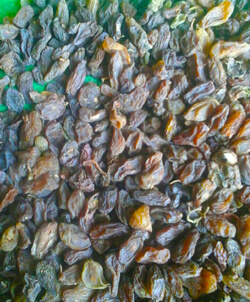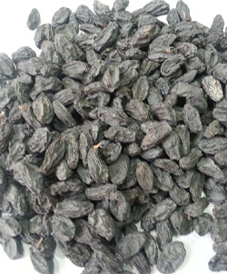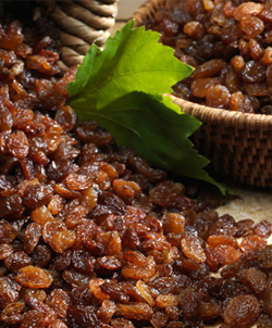 Raisins produced from Thompson seedless sultana grape variety. They are directly sun-dried in the open air on cement slabs and a dark-brown color.